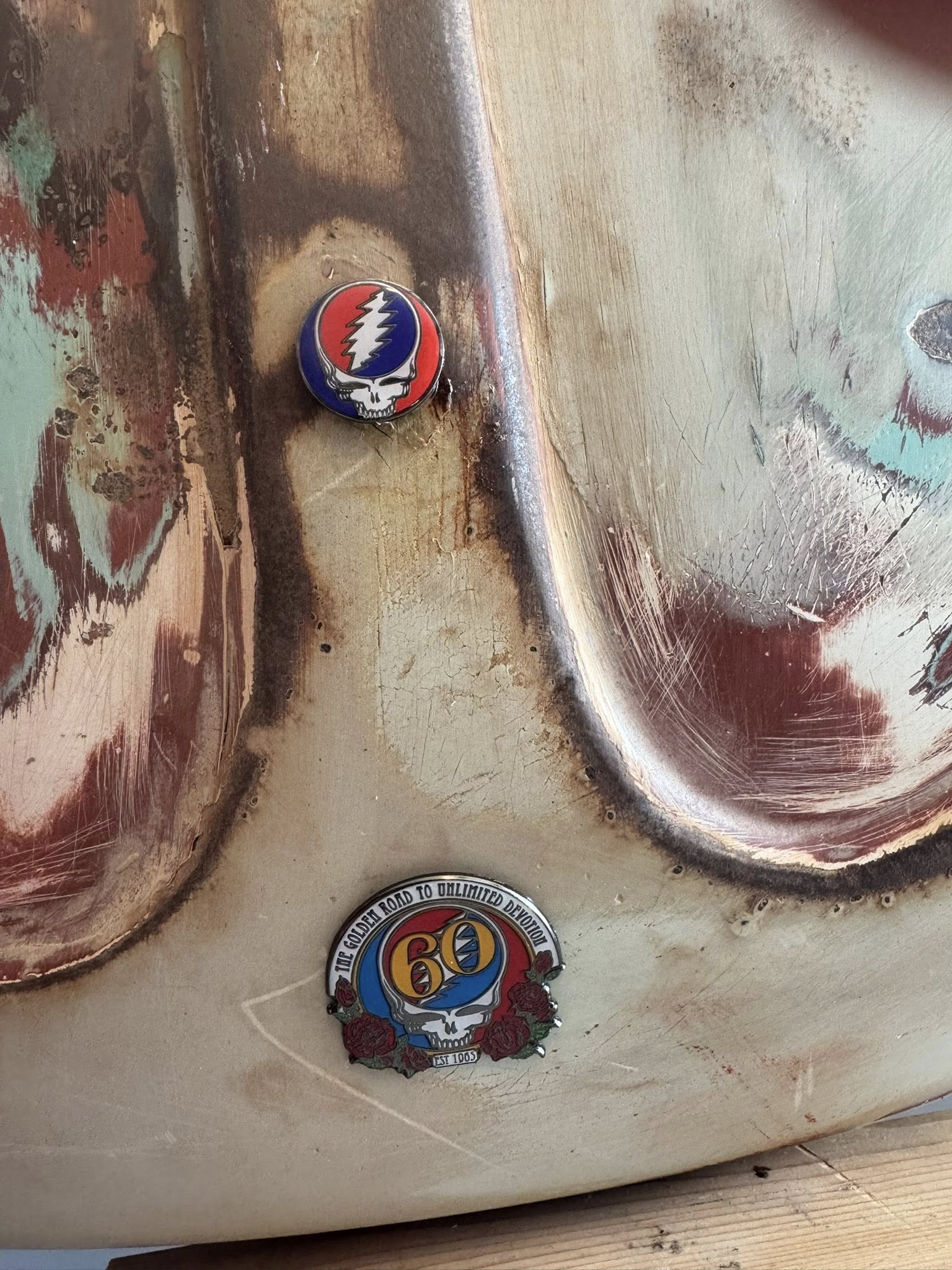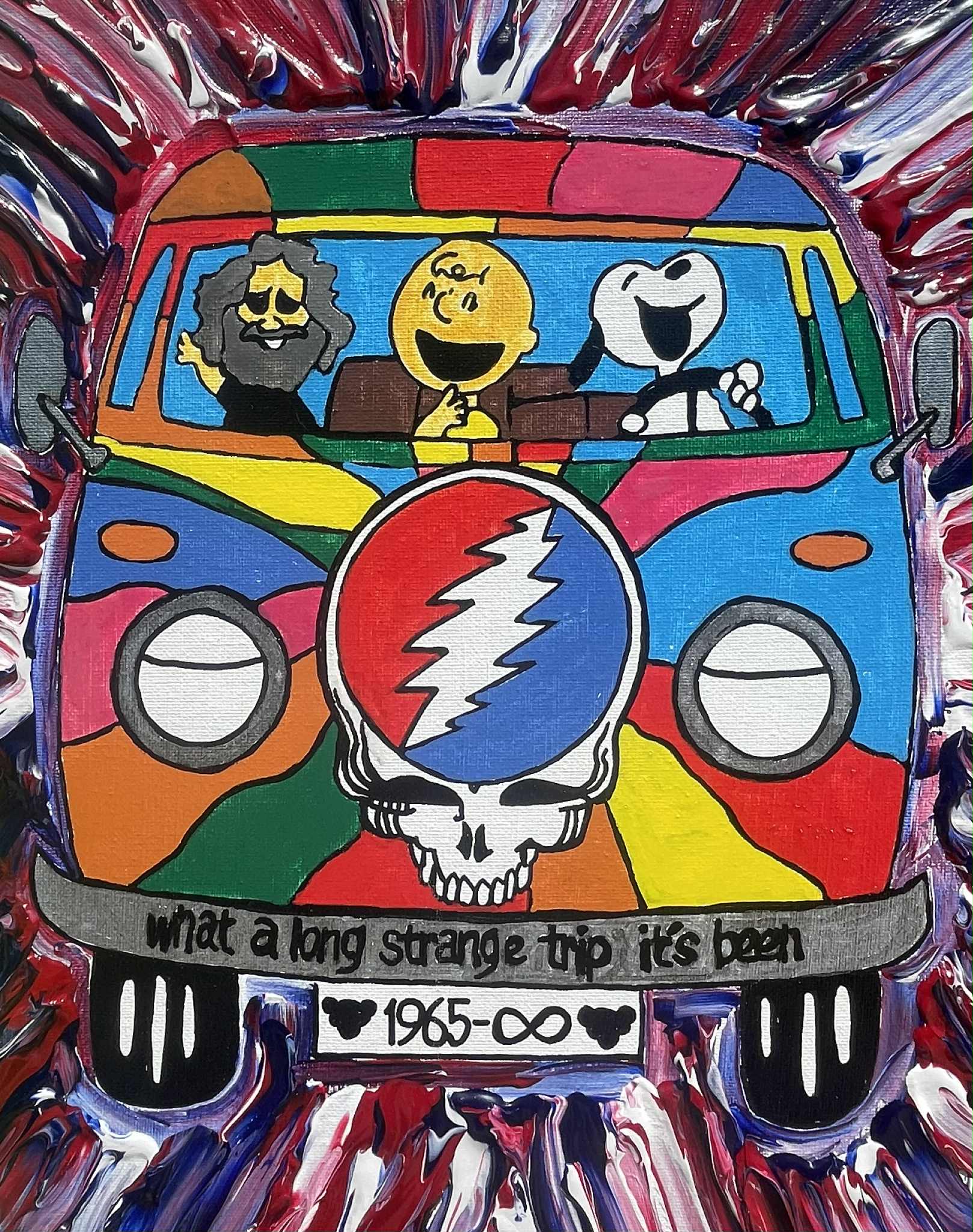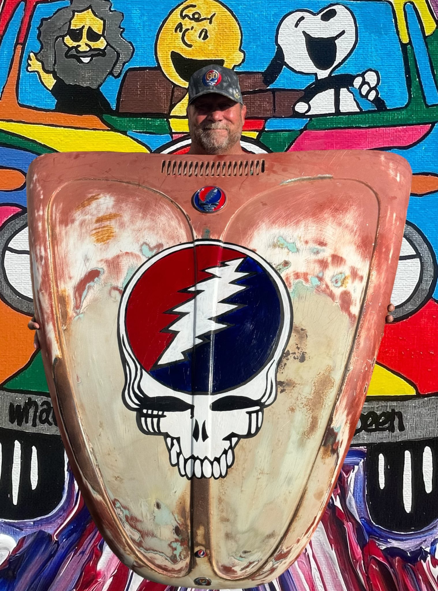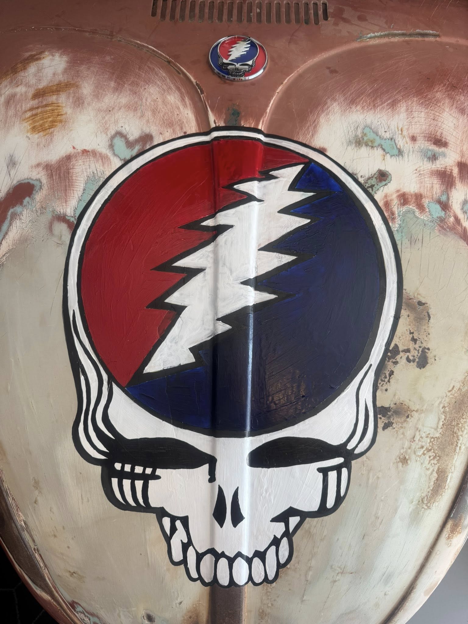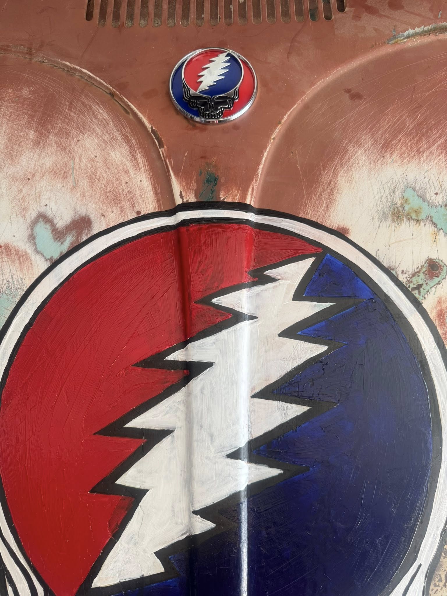 1965 was a special year with this piece as it was the year the Grateful Dead played their first shows. This '65 Volkswagen Bug Hood was collecting dust in a friends garage, after my excitement of telling him of my trip to San Francisco where it all began for GD60. He gifted it to me, so we can make a Dead Head who is on the bus a nice piece of art.